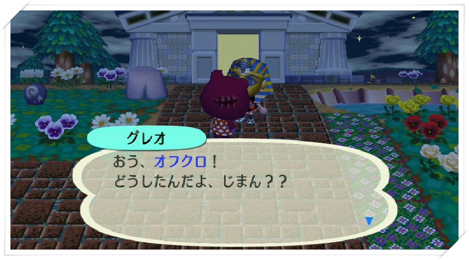 初めて ともさんの村へ潜入してきましたずいぶん前からお会いしていたんだけどコードが満杯で交換できなかったピコーーン!!と何か感じるものw(変態感知センサー?)があったんだけど 残念っす~でもでも半年近くたってやっと縁があって交換できました^^可愛いビスのくせに、獰猛なタランチュラ飼っててフイタ。部屋を出たら先に出ていたフレに「ウエルカム網たたきの刑」に処されてうけたwww「ありーーー」とお礼を言う3人組・・・ この村はなんか変その頃 フルーツ村のとある場所では監視が続いていた。拡大うp真夜中のテンションと初めて聞いたwオヤジギャグ なので不問する事になりました次回は気をつけるように!!ともさんの村の 不思議スポット!?ジョニー家具をありがとう^^はんぱなく傾いてましたwwwジョニーはうちの村に来る予定あるのかしら~~ お ま け ウチと、ともさんのグレオが同じファッションだったーーー兄弟分なんだぜぇ。ともさんもグレオのいやらしい笑顔に首ったけのはずなんだぜぇ。終わり。
