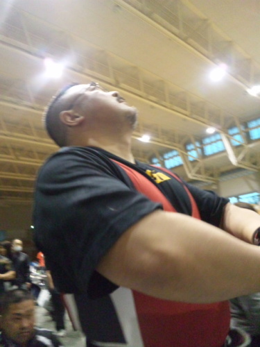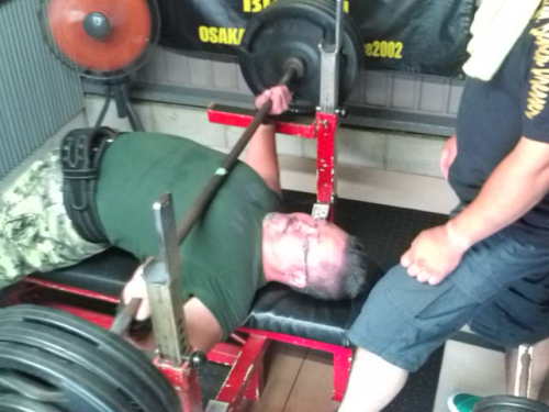 さる7月21日(日)、和歌山県立補助体育館において第17回和歌山県ベンチプレス選手権大会が開催された。 この大会に我が所属のバリバリジムから、93kg以下級に「課長」さん、74kg以下級に「コダイ・キッド」さんが、それぞれ他府県所属というコトでオープン参戦をしたのである。 課長さんとコダイ・キッドさんは、なぜかバリバリジム内において「へたれの部」なるものを結成している。むろんお2人とも「へたれ」などではなく、とくに課長さんに至ってはJAPANオープン・マスターズではチャンピオンになっているほどの超強豪である。 今回の試合参戦に関しては「へたれの部」の部内行事の一環であり、本当はジム内においてすらも極秘の裡(うち)に全てが進行する予定だったのだが、ひょんなコトからそれを知った俺は、応援&セコンドに出向くことに決めた。 当日朝より愛馬ハーレー・ダビッドソン「ロード・キング号」を駆り会場を訪れると、コダイ・キッドさんの所有する高級車で、選手のお2人と、最近「へたれの部」に浸かりつつあるセコンド役のヤッサンが先に到着していた。 それぞれの調子を尋ねると、課長さんはシゴトの激務により疲労が著しく低調とのコト。かたやコダイ・キッドさんはベンチプレスを始めた頃からの最終目標である120kgプレスまでも視野に入れているというコトで非常に楽しみ。 試合は、第1セッションにフルギア全員、第2セッションにノーギア女子および男子軽量級、第3セッションにノーギア男子中量級&重量級というコンパクトな大会で、進行も早い。 ただ会場である補助体育館には空調設備もなく、座っているだけで汗が滴り落ちるほどの暑さ。そこへ筋肉の塊(かたまり)の如きマッチョがひしめいているのだから、たまらない。 あまりの暑さに参った参った。 バリバリジムの2人は第3セッションに登場するので、第2セッションが開始されたあたりからウォームアップ開始。両人とも最終アップセットまで、バーベルが軽い! いよいよ試合開始。 コダイ・キッドさんの第1試技は110kgにて。 バーベルをラックから外して構えるも、主審がスタートを中々かけてくれない。 辛うじてスタート・コールが掛かるが、長くバーベルを保持したためか、かなり重そう。白3本。成功! 幾人かの選手の試技を挟んで、続いて課長さんの第1試技。160kgにて。不調とのコトであったがこの重量でスタートするのだから、やはり強い。 軽くクリアし、白3本。成功! 第2試技。 コダイ・キッドさん。試技に入る前に係員より「シャツが出ているのでちゃんとスパッツの中に入れて下さい」と注意が。 競技用のツリパンではなくTシャツとスパッツを着用するコトもOKなのだが、その場合シャツの裾(すそ)を出していては尻がベンチ台に密着しているかどうかの判断が出来ないので、シャツはキチンとスパッツの中に入れておかなくてはならないのだ。 シャツの裾を直して試技開始。これまでの公式戦自己ベストを2.5kg上回る117.5kgに挑む。 バーベルを構えるが、第1試技に続いてスタートが掛からない。そして遂に、あろうことか主審から「リプレイス!(バーベルをラックに戻せ)」のコールが。「81cmラインがはっきり見えてますから」と主審の指摘が。 ベンチプレスの公式ルールでは両手幅が81cm以内と定められており、バーベルシャフトに刻まれたこの81cmの目印が主審から見えるというコトは、それ以上の手幅で握っていると判断されるのだ。 じつはコダイ・キッドさんがバーベルをラックから外す際の動作を手伝う「センター補助」を務めたのは俺だったのだが、グリップが81cmを超えていたコトに全く気付かず、本当に申し訳ないコトをしてしまった・・・。 リプレイス後に再度試技に挑むも、集中力を切らしてしまったためか敢え無く撃沈。失敗。 課長さんの第2試技は165kg。 差し切るかと思ったのだが、肘のロックがならず赤3本。失敗。 いよいよ第3試技。 コダイ・キッドさんがプラット・フォームに入ろうとすると、またもやシャツの裾を入れるよう指示が・・・。 当初の予定ではこの試技では120kgに挑むはずだったのだが、第2試技で失敗した117.5kgに再挑戦である。 なんとバーベルを下ろす軌道が普段の練習時よりもひどく首寄りになってしまい、本来のパワーを発揮出来ずボトムで潰れた。残念だが失敗。 課長さん、165kgに再チャレンジ。 左が遅れてしまい、そのまま肘をロックできずバーベルが挙上途中で停止。主審からストップが掛かり、惜しくも失敗。 ↑ 課長さんの力強いプレス(この画像は今回の試合のものではありません)。 試合後のお2人の感想を聞くと・・・。 課長さん。結果160kg。「調子が悪い割には、まあ挙がった方かなと思う」 満足はしていないけれど納得のご様子か。 コダイ・キッドさん。結果110kg。「81cmが見えてるとか、シャツが出てるとか・・・俺、嫌われてるんか!? 俺にばっかり細かいコト言うて厳しくしやがって!」 と、かなりのご立腹。 そこで、セコンドを務めていた
