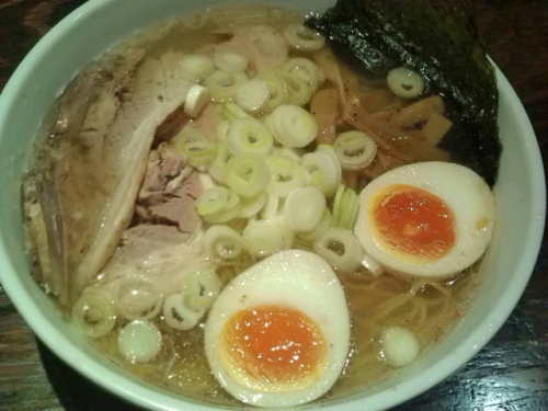 6月2日(日)。 昼、愛馬ハーレー・ダビッドソン「ロード・キング号」を駆り、かねてより気になっていたラーメン屋「熟鶏らーめん しゅうじ」(大阪市生野区生野西2-1-29)へ。 ラーメン専門誌によると、ここの鶏パイタンラーメンはドロドロで「まるでパスタのカルボナーラのよう」なのだという。コッテリ濃厚好きな俺としては、ぜひとも食べておきたい。 場所はJR環状線寺田町駅の北口を出て右手、徒歩1分程度。かの有名な「麺屋わっしょい」のスグ近くである。駐車場はナシ。 到着すると店内はほぼ満席。中々の人気店のようだ。 目当ての「ドロ鶏白湯」(780円)を塩味で注文。醤油味も選択可能である。 画像では判りにくいかもしれないが、スープの粘度が凄まじい! これはラーメン雑誌に書かれた「カルボナーラのよう」というコメントすら生ぬるい。まさしくドロドロの極みで、もはやスープというよりはペーストである。 タンパク質を大量に摂取するために鳥のササミをミキサーにかけてゴクゴク飲んだという、日本稀代のコンテスト・ボディビルダーである故・マッスル北村さんの逸話を彷彿とさせる逸品だ。 それにしてもこのスープ、本当に鶏肉をミキサーにかけて作ったんじゃあるまいか。。。 麺を箸で持ち上げると「スープがよく絡む」などというレベルでは無く、「スープが乗っかってくる」といった方が良い。 麺はわずかにウェーブの掛かった中太麺で、香りも良くかなり秀逸だと思うのだが、スープのインパクトが凄すぎて、よほど気をつけないと印象に残らない。 具はチャーシュー2枚、味玉半個、メンマ、刻みネギ、糸唐辛子。ちなみにメニューのどこを探しても載っていなかったので、追加トッピングは無いらしい。まあ、スープ自体が具のようなモノなので構わないが・・・。 麺を食べ終わってスープを飲み干そうと丼を傾けても、粘度が凄すぎて口の中に流れ込んで来ない。やむなくレンゲですくい取って、スープを「食べる」。 なお、ペッパーオイルをはじめとして、カウンターには6種類の追加調味料が備えられており、自在な味変が可能。 ランチタイムはごはん(大・中・小すべて)が無料で注文できるお得なサービスも有り。 鶏パイタンのラーメンとしては「天下一品」の「中華そば こってり」が、その濃度を満天下に轟かせているが、ハッキリ言ってココの「ドロ鶏白湯」は天下一品の5倍の粘度を誇るドロドロ濃厚っぷりである。 こってりラーメン好きの方には、ぜひ一度味わってみるコトをオススメしたい。【今年のラーメン 15杯目 ☆4.0】 帰宅後、トレ! いよいよ試合用トレーニング・ルーティンに突入だぜ!【ベンチ・プレスの日】ベンチプレス 60kg*6 60kg*6 60kg*6(試合フォーム止めナシ) 60kg*6 80kg*6 100kg*6 120kg*1 140kg*1 150kg*1 155kg*1 157.5kg*1 145kg*3 145kg*3 145kg*2(以上、試合フォーム止め有り) 132.5kg*3 132.5kg*3(以上、足上げナロー止め有り)腕立て伏せ 自重*50 ううむ。 こってりラーメンでパワー充満、と思ったのだけれど筋出力は今イチ。。。 ラーメンを消化するのに、カラダの内部から疲れてしまったのかな・・・?
