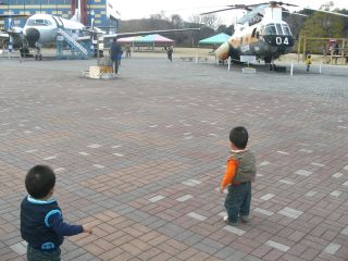 へ義ババと私とふたごっちで行ってきました♪すぐ近くにあるもののまだ行った事がなかったのですが、最近朝の散歩の時に飛行機や自衛隊のヘリコプターが通ると『あぁぁぁ!!ブーン、ブーン♪♪(飛行機の事)』と言って大興奮のふたごっちをみてババが連れて行ってやりたいな~・・・と独り言のようにつぶやいたので『じゃあお昼から行こうか?』と・・・私って良い嫁??博物館行ってもまだ双子には理解できないかなーって思っていたんですが博物館の前にある広場には実物大の飛行機やヘリコプター自衛隊の戦闘機のようなものが5機ほど置いてあり、その他に遊具や芝生なんかもあって十分楽しめました♪♪到着するとここは何処?!という感じでキョロキョロしながら歩き出した二人でしたが目の前に登場した大きな飛行機を発見したとたん後ずさり・・・ホント小心者なのよねぇ~(__;ソラ、リク【恐いなぁ~…いつも見るのはこんなに大きくないんだもん】私が『飛行機だよ~いつもお空に飛んでるのと同じだよ』と言ってももう既に半泣き状態・・・仕方なく抱っこして徐々に近づく作戦に10分位するとようやく慣れてきてくれました(´о`;ソラ、リク【もう平気だよ~♪♪】慣れればこっちのもの♪あっちこっちへ走り回り大興奮ソラはお得意の変なダンスも踊ってたよ( ̄∇ ̄;曇り空でちょっと寒かったけど春になったらお弁当もって遊びに来ようね♪