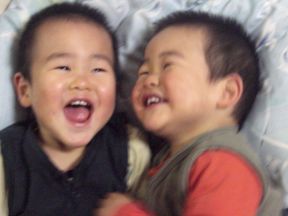 当たり前と言えば当たり前なんでしょうが、最近更にお互いを意識するようになった二人…とにかく相手の行動が気になってしかたがないようです(^^;見ているぶんには楽しいし可愛いから良いんだけど終わりが無く繰り返される事が多く私の方がギブアップしてしまう事も…例えば、食事の時まだちょっと冷めてない食べ物があってソラがフーフーしてと私にお好み焼きを渡してきました。触ってみると確かにちょっとだけ熱いかも?だったので『ゴメンネ熱かったね、フーフーするね』と言ってやってあげると満足して口に入れました。すると、それまで全然平気で食べてたリクが、僕も!!と言わんばかりにお好み焼きを渡そうとするんです私が『リク今まで食べてたでしょ?熱くないよ』と行っても首を横に振ってん~ん~と差し出してきます。しかたがないので、フーフーするとニッコリして口に入れる…ここで終わればなんて可愛いの(≧∇≦)で済むのですが結局全部食べ終わるまでフーフーさせられました(__;もちろんお好み焼きは完全に冷めてます…ちなみに私がフーっとするのと一緒に二人も一生懸命フーフーしてますこれはこれでめちゃめちゃ可愛い(笑)あと、どちらかが転んだ時手が痛いと差し出したので『痛いの痛いのとんでけ~』をするとそれを見ていたもう一人が、僕も!!と痛そうな顔をして手をだしてくる『転んでないから痛くないよ~』と言ってもやってもらえるまで痛そうに手を押さえてるしかたがないのでやってあげると、またまたもう一人が今度は足をおさえてうったえる…両手、両足、頭や顔……私が『もうどこも痛くないの!!』と怒るまで永遠と続きます(__;みんなこんな感じなのでしょうか?まぁ彼らにとっては遊びの一つなんでしょうね( ̄∇ ̄;でも散歩の時なんかに一人が抱っこをせがんで婆が抱っこをしてしまうともうお終い僕も!僕も!で歩かなくなっちゃう本当は歩きたいから抱っこすると今度は降ろせ!降りたとたん一人が抱っこしてもらってるのを見てやっぱり抱っこ…大人が二人いるのがわかるからあまえちゃうのかな?とにかくなんでも同じが良いふたり仲が良い事はいい事なんだけどね( ̄- ̄;