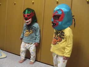 朝から振り出した雨は弱まる事なく降り続いて今日はお散歩もお出掛けも出来なかったよ( ̄д ̄;みんなこんな日は何をして過ごしていますか?ウチは体調悪い日意外はほぼ毎日私とふたごっち3人で出かけてるのでお家でなにをしたらいいのか…本読んだり積み木で遊ぶものの長くは続かず結局電車のビデオにたどりついてしまうんだよねふたごっちはお外に行けないからブーブー言うしケンカばかりで久し振りに一日が長く感じました。ビデオにも飽きた二人はとうとうこんなものかぶって遊びだした( ̄∇ ̄;旦那のものなんだけど普通こういうのってかぶるのイヤがるんじゃないの?二人は自分でかぶってお互いの顔みて大笑い(≧∇≦)マスクがずれて前が見えないと危ないのでついてまわるこっちの身にもなって欲しいよ(__;夜にはイトコ一家が旦那のスロットを一台譲るため我家にやってきました♪パワー有り余ってたふたごっちは6歳になるアヤ姉ちゃんに沢山遊んでもらってご満悦♪♪でんぐり返しやアップップーを教えてもらったよ(^∇^)