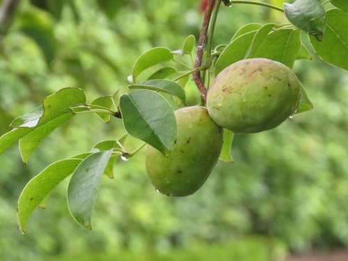大型の強い台風24号が九州の西、東シナ海を北上中・・・今日も一日雨でした。雨が止んだ時、月下美人の鉢植えを車庫へ移動して、家の周りに置いている物を風に飛ばされない様にちょっと整理をしました。オオイタは明日の夕方から暴風、強風内に入る様ですね。台風による被害は無いことを願います。今日の写真は庭で写したのを紹介です。ムベの実裏の彼岸桜に巻き付かせて育てているムベ(西洋アケビ)です。今年は沢山実を付けました。ひとつの枝に2つ生ったのも多くありますね。収穫はこう少し先、実が赤紫に熟れてからです。11:59●ニガウリグリーンカーテンのニガウリです。下の方は葉は枯れてしまい、小さいニガウリがまだ5個ほどが生っています。収穫しようかと、実を見たら同じ色したカメムシが止まっていました。ニガウリを食べるカメムシがいるのですね。●アオクサカメムシニガウリに止まっているカメムシをUPで・・・アオクサカメムシでした。庭の花●トレニア(ナツスミレ)庭のトレニアは、こぼれ種が地生えしたもので、花壇に移植したり、そのままだったり・・まだ沢山花が咲いています。ほとんどが紺色の花ですが、ピンクや赤紫も少し咲いています。赤紫白にピンクスミレ色に紺・・・庭に咲いているトレニアはほとんどがこのタイプです。楽天ブログ、いつの間にか7でも、クチコミ、絵文字が入れられる様に戻っていましたね。