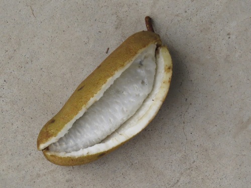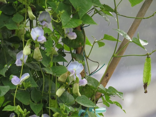 台風27号の影響で雨の一日でした。昨日近くの土手の竹林に久しぶりに入ってみると、木に巻き付いているアケビに実が生っているのを見つけました・・実は6個ほど生っていたが、4個は割れて中身がなく、2個はまだ割れていませんでした。台風の雨が続く様なので、雨が降る中、アケビを採って来ました。竹の先に鎌を結んで採りましたが、ひとつは鎌で切ってしまいです・・・舌触りはぬぺっとして、味は甘味のあるミルク味と言うか?まあ美味しかったです。40年ぶりに食べましたが、期待した程では無く、こんな味だったけ?でしたね。ムベの方が甘く美味しく思いました。風の無い雨だったので、軒下で西洋桜草の苗のポット移植を2時間ほどしました。今日50個ほどを移植して、全部で240個ほどになりました。西洋桜草の苗ハボタンの苗、元気に育っていますが、去年と同じくちょっと背丈高いタイップを育ててしまいです。花壇には松葉ボタン、メランポジュームなどが植わっているので、まだ植える場所が無く・・雨も続き花壇の整理が出来ずです・・ポットに入ったままだと大きくならないので、これもまた良しです。ハボタンの苗今年は暖かく青虫が付いて、葉がダイブ食べられてしまいましたね。おまけ西洋桜草の苗を移植していたら、ホウジャクが垣根のカナメの葉に止まったのでカメラを取ってきて写しました。名前はヒメクロホウジャクの様です。ヒメクロホウジャク