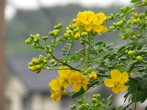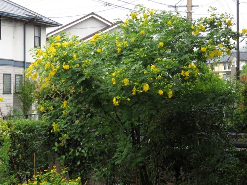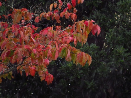 台風27号の影響で雨の一日でした。台風は当初の予報より南を通る様で、強風より雨台風となりましたね。ちょっと前に、安い三脚を買ったが、どんな時に使えば良いのだろう・・今日、軒下から三脚を使って前の公園のハナミズキや隣のモミジと雨を写して見ました(使わなくても良い様なですが)。ハナミズキまでちょっと距離があるが・・条件を色々と替えて写してみて・・結局は今一でした。ハナミズキと雨隣の家のモミジを見て、ハナミズキよりこっちらを写した方が良かったと・・小雨だったが、雨のモミジを写してみました。モミジと雨雨の中、公園の前の電線に沢山のムクドリが集まっていました。10羽ほどが、公園のハナミズキに群がり実を食べていましたが写せずでした。ムクドリおまけコバノセンナは日中開いていた葉が日没と共に閉じてしまいます。葉が閉じた夜の様子を写してみました。花も新しい花は少し閉じる様ですが、開いてしまったのはそのままでしたね。夜のコバノセンナ