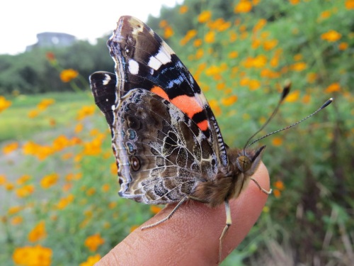 午前中は晴れて湿度が高くメチャ暑い日となりました。最高28.5℃、最低23.0℃。西の山の方の空には雨雲が出て、午後は晴れ間が出るも雨が降りそうな曇り空となりましたが、裏の土手のキバナコスモスと直ぐ近くのミゾソバの花が咲いている川に行き、花に来る昆虫観察をしました。今日写した蝶は?アカタテハ階段下まで降りたら、アカタテハはキバナコスモスの花に飛んで来て止まりましたが、接写しても直ぐには逃げず・・逃げて歩道に降りたが、飛び方が少しぎこちなく・・二度ほど追いかけて、手を出すと逃げる力もなく、止まってくれました。良く見たら、前の羽の片方の付け根を痛めていました。多分、カマキリにやられたのでしょうね?羽を広げた所も風に負けだらり・・キバナコスモスの花に止まらせてみましたが・・・ミゾソバの花と昆虫を見た後、帰りに確認すると花の裏にぶら下がっていました。元気になって欲しいが・・・・ヒメアカタテハミゾソバの花にヒメアカタテハが一匹居ました。羽を広げた所が上から写せたので比較に載せました。ヒメアカタテハは下羽の体の近くまで模様があるが、アカタテハは無いのが特徴ですね。ホシホウジャク今日もキバナコスモスに来るホウジャクを写しました。ホウジャクが8匹ほどが飛び回っていて・・階段に座り、花に来るホウジャクを待ち、接写で10枚ほど写してみましたが、上手く行かずでした。その中の一枚です。近くの泡立ち草の花の蜜を吸っている所を・・・イシガケチョウ今日も、昨日と同じ所の泡立ち草の花にイシガケチョウが居ました。昨日と同じ蝶でしょうね。UPで画面いっぱいに写しました。ホトトギス前の公園の反対側の家には、エゴノキが植わっていて、ヤマガラが実を食べに来ます。ヤマガラを写しに行って見たが現れず・・・歩道側に植えられているホトトギズに花が咲き始めいました。シラネセンキュウ(白根川芎) 別名:スズカゼリ借りてる畑近くの竹林側の土手に咲き始めた野草です。今日までヤマゼリと思っていましたが、念のため調べたら、ヤマゼリは茎が細く、花の付き方も少し違っていて・・シラネセンキュウが正しいかった様です。この時期に30℃近いのは異常ですね。短パンに半袖でも汗が出て・・・何時になったら涼しくなるのでしょう・・・