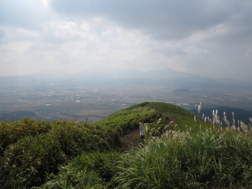 2013-10-03 の日記台風が北上中で、今日まで晴れの予報だったし、妻のバイトが休みなので、阿蘇外輪山の大観峰とくじゅう花公園へ行って観る事にしました。大観峰は2週間ほど前のテレビニュースで初めて知りです。大観峰近くには牧場が多く、道沿いのススキがとても綺麗でした。帰りにススキ、牛を写そうと思い、大観峰まで車を走らました。初めての大観峰なのに、生憎ガスっていて、くじゅう連山や阿蘇山の山々は霞んで綺麗に見えずでした。そう言えば、昨日の中国のpm2.5のニュースで、九州にも来ると行ったいましたね。先端から南の阿蘇の山々方向写真に写っている女性は妻ではありません!10:22ガスってない快晴だと下の写真の様に写るようです。綺麗に見える時写真が案内看板に有ったので写しました。東側の外輪山の様子です。10:07西側の様子です。10:46阿蘇の小学生が野外教育で来ていて、A5サイズに小さい紙に絵を描いていましたね。石の高い記念には子供が沢山いたので写せずでした・・・10:18先端の所で妻を写しました。大観峰の文字を写した写真がこれだけだったので載せました。10:44駐車場のある北側方向10:51駐車場からススキをメインに写してみました。11:4011:39次にくじゅう花公園へ行きましたが、牧場の牛が居た道は通らず、牧場の様子は写せずでした。●長者原帰り道、最後に寄った長者原の写真を2枚紹介します。ススキは咲き始めばかりで・・中に入って見たが、曇り空でみるススキは今一で・・歩いている人は居なくて・・ちょっと見て引き返しました。駐車場には10台ほど止まっていて、数人いましたが・・・15:4915:55くじゅう花公園はタイトルを替えて更新です。沢山写真を写すとブログ更新も大変です・・・