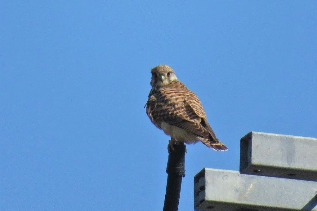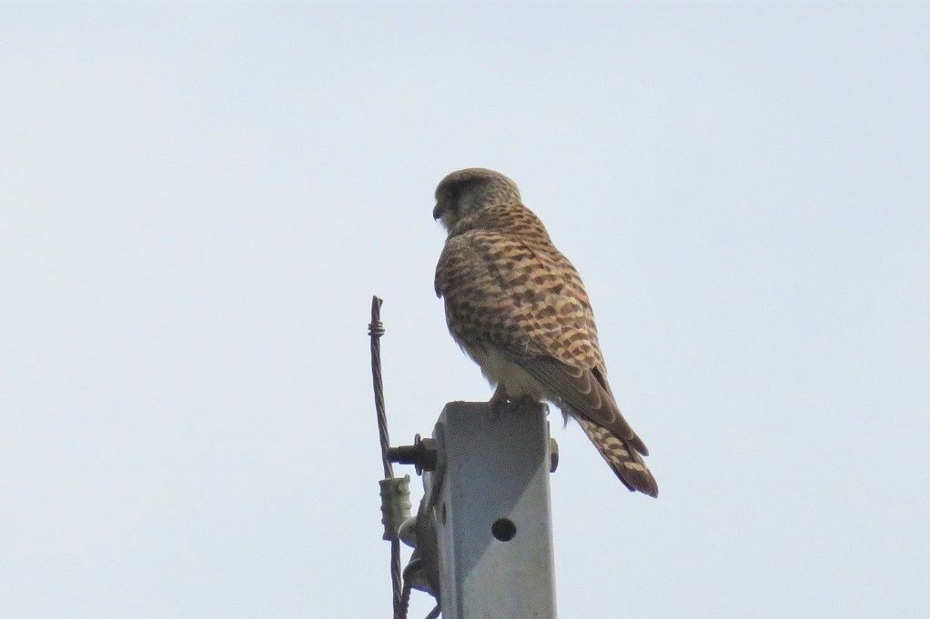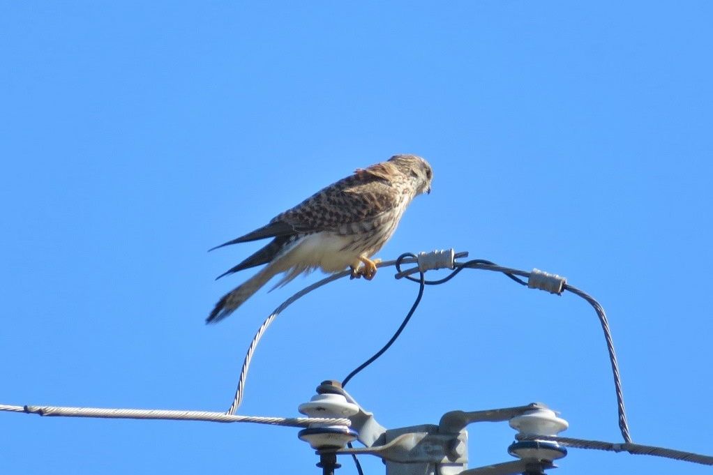 午後、裏の小川沿いの散歩・散策に行き・・・今日も神社のイチョウに木にチョウゲンボウ♀が居て、チョウゲンボウ♀ 13:15田んぼの隅に餌(虫)を狙って下りた後、神社下の電柱の天辺に止まりでした。人間ズーム、近づいて撮り・・・逃げる所はタイミングが合わず・・・チョウゲンボウ♀_6654 13:19二つほど下流の方の電柱に止まり・・・近づきながら撮りです。13:20連写モードに切り替えて・・・チョウゲンボウ♀_6657 13:20電線が邪魔でしたが、どうにか飛び立つ所が撮れました。300m程下流の所の電柱の天辺に止まっていて・・・13:25横に飛ぼ立ってくれたので、珍しく連写で3枚綺麗に撮れました。チョウゲンボウ♀_6662 13:2513:25今日の散歩では沢山写真を撮ったので、鳥ごとにタイトルを分けて更新します。