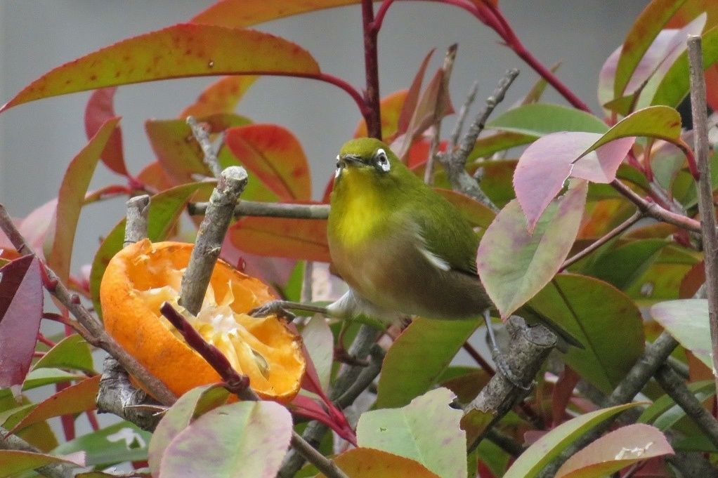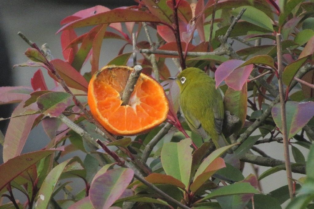 実家から貰って来たミカンをちょっと腐ったミカンを優先して・・メジロ用に玄関前の垣根のベニカナメとナニワイバラの下側に挿しています。メジロ 8:559時前に部屋から覗いてみたら、両方のミカンにメジロが来ていました。部屋撮りです。ペアが来ていて・・・メジロ 8:55メジロの♂♀は、喉元から胸にかけての黄色い色で見分ける事が出来、胸の方まで黄色いのが♂ですが、喉元だけなので♀と思われます。♂♀で鳴き声が違うので、鳴いてくれれば♂♀を見分ける事も出来ますね。スズメ(庭)_6512 10:06メジロ用に出しているミカンですが、ほとんどは庭に住み付いているスズメ達が食べですね。スズメ 10:13スズメ達にはインコ用の餌を朝夕与えているが、ミカンも好んで食べです。水代わりでしょうか?スズメ 10:14ヒヨドリに食べられるよりは良いので、ミカンが無くなったら新しいのを与えです。スズメ達も食べる順番がある様で、追い払ってひとりで食べたり・・・仲良く食べているのはペアでしょうかね。シジュウカラ 16:37シジュウカラもペアで庭にやって来て、裏の彼岸花に居た所が撮れました。おまけ;月&金星&木星 6:46昨日は雨で見れず、早朝の東の空、三日月は金星(明けの明星)の近くに有りましたね。月&金星&木星_6502 6:48明るくなってきた東の空と公園の木々を入れて撮りです。三日月 6:28今朝は綺麗な三日月(月齢 26.1)でしたね。実家手伝いで、食料の買い出しが近所のスーパーに限られていたので・・・午前は食料の買い出しの運転手をしてです。