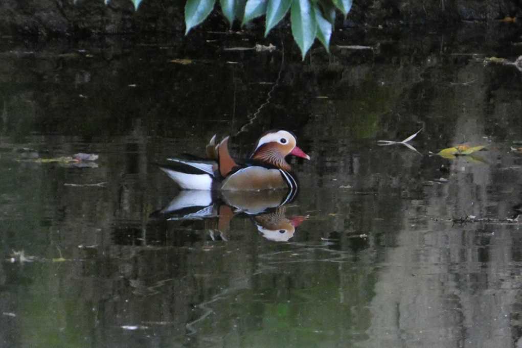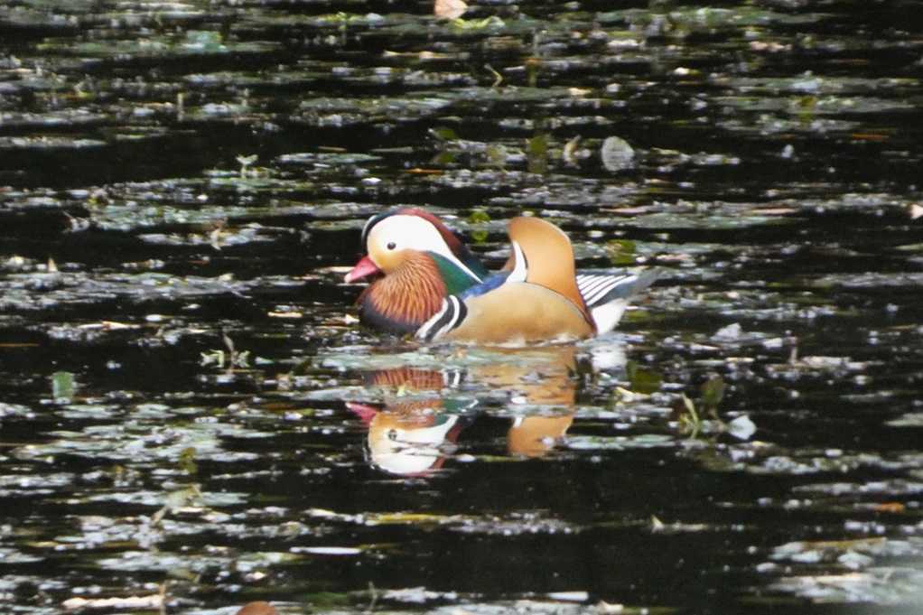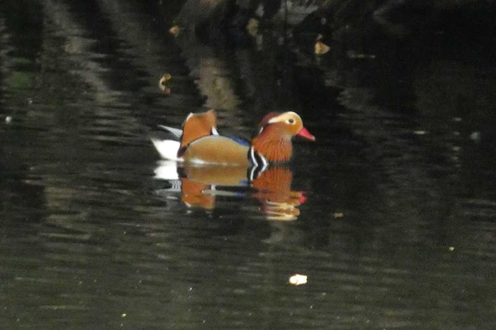 曇りのち晴れ。最高気温 16.6℃、最低 7.7℃。朝、今季一番の冷え込みになりました。午後、裏の小川や小川沿いで生活している鳥、トンボ、蝶などの観察の散歩に行きです。今日も山間の溜池を覗きオシドリ達を撮ったので、先ずは溜池のオシドリなどの紹介から、溜池にはマガモ、カルガモなどは来てなくて、オシドリが10数羽居ました。オシドリ♂ 14:09左側堤からそっと覗き、池の中央当たりに居たオシドリ♂を・・オシドリ達 14:09前の奥にはオシドリ達が集まって居たが、直ぐに左や奥へ隠れてしまい・・オシドリ♂ 14:10明るい所に居た♂を・・オシドリ♂ 14:12待っていると♂が姿を現して・・カイツブリ 14:12カイツブリが前に現れて・・直ぐ潜って何処かへ消えて・・オシドリ♂ 14:14奥の竹に♂が止まっていて・・オシドリは水かきがなく木の止まるのが上手です。オシドリ♂ 14:15ちょっと明るい所に現れた♂・・オシドリ♀ 14:18♀が左奥へ移動して行き・・オシドリ♂ 14:19奥の方で泳いでいた♂・・オシドリ♂ 14:19これを最後に、オシドリは奥の森などに隠れてしまい見えなくなりでした。ここのオシドリ達は人に敏感で、堤の右側から覗いて見たが、オシドリ達は見当たらずでした。カワセミ♂ 14:20オシドリ達が見えなくなってから、カワセミ♂が現れです。カワセミ♂ 14:22ちょっと遠い暗い場所に止まり、ピントがイマイチの写真となりでした。堤に上がってしまうとオシドリ達が飛んで逃げて行くので、遠くから撮りでした。近くでも逃げないカワセミ君に思えです。