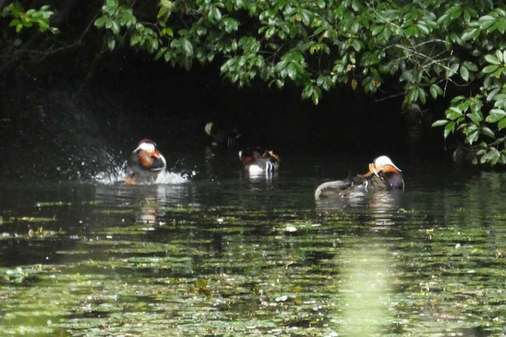 曇り。最高気温 18.9℃、最低 14.0℃。7日頃からブログ更新が出来ずでしたが、今日昼前に更新サイトに入れて、写真登録が出来たので更新してみます。午後、裏の小川や小川沿いで生活している鳥、トンボ、蝶などの観察の散歩に行きです。曇りでトンボや蝶はほとんど活動してなくて、溜池のオシドリ達と小川沿い散歩でカワセミなど沢山撮ったので分けて更新です。先ずは山間の溜池に来ているオシドリ達の紹介。集落の道を歩いて居たら、溜池の方からオシドリの鳴き声が聞こえて来て、溜池を覗いて見る事にしました。オシドリ達 13:52堤左側からそっと覗くと、右奥でオシドリ達が水浴びをしていました。オシドリ達 13:52激しく動き回って水浴びをするのも居て・・オシドリ達 13:53オシドリ達 13:53上手く撮れたり、水飛沫だけになったり・・オシドリ達 13:53オシドリ達 13:54オシドリ♂♀ 13:56ちょっとピンボケですが、♂♀の水浴びも撮れて・・オシドリ♂♀ 13:55♂♀の向こう側を激しく泳いで行くのが居たり、潜るのも居ましたね。オシドリ達 13:58堤右側から覗くと、池の左側にもオシドリ達が居ました。オシドリ達 13:59殆どが♂で、♀は見当たらず・・オシドリ達 13:59♂7羽ほど居ました。オシドリ♂♀ 14:00♂をUP撮ったら、♀が1羽写っていました。オシドリ♂ 14:00♂をUPで・・オシドリ♂&カイツブリ 14:01カイツブリが1羽居て、オシドリ♂&カイツブリ 14:01オシドリ♂と一緒に撮り・・オシドリ達 14:04再度、堤左側から覗き・・オシドリ達 14:04奥に逃げて行くオシドリ達を撮りでした。今日は20羽程のオシドリが来ていましたね。