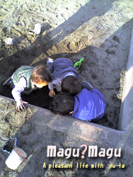暖かくなってきましたよね~(^0^)今日なんてすごくいいお天気!風もない♪昨日の夜中から急に寒気がしてきて、明け方38度7分も熱がでてしまいました(><)頭はズガンズガン。はんてんを着て毛布をかぶって布団かけて、さらに毛布をかけても寒かった(^^;)なんだろうねえ、咳もでてないし、鼻水もでてないんだけど。薬を飲んで寝たら、昼過ぎには熱が下がりました。自分の体調はかなりイマイチだったんだけど、せっかくのお天気なのでそれでも ぷー太を公園に連れて行ったんですよね。もしかして 私って母の鑑?(笑)出かけてすぐにちょっと後悔、、、体だっるぅ~~~~(--;)でも ぷー太はとっても楽しそう♪やっぱ連れてきてあげてよかった(^^) お山をつくってるよ。同じ歳くらいの子が多いので、公園は本当に楽しいみたい(^^)、、、でも私は死亡、、、、、ぐえええ