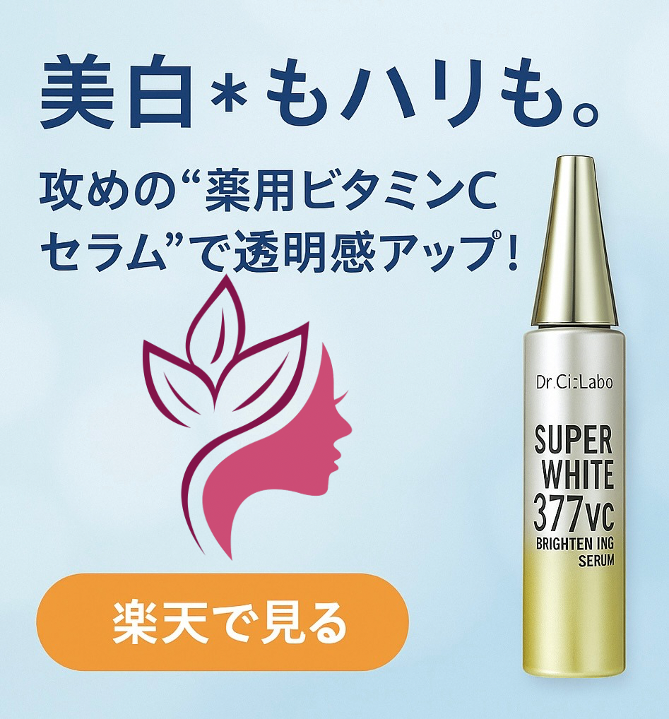 [シミ,くすみ、ハリ不足が気になる方へ][[ドクターシーラボスーパーホワイト 377VCセラム]は、高浸透ビタミンC 誘導体✖️独自美白成分[WHITE377] 配合の薬用セラム ✅シミ、そばかすを防ぐ美白ケア ✅乾燥によるくすみ、肌のごわっきを集中 ケア ✅ナイアシンアミド配合でハリのある若々 しい肌に ✅無香料、無着色、パラベンフリー、アル コールフリー 朝朝晩1日2回、化粧水のあとにサッとひと 塗り使うほどに肌がなめらか&ワントーン 明るく✳️1本で1ヶ月分/持ち運びしやすいコンパクト サイズ[[楽天で見る]✳️美白:メラニンの生成を抑え、シミやそばかす を防ぐ。敏感肌には使っていただきたい 商品です。【公式】 ドクターシーラボ 高浸透 美容液 スーパーホワイト377VC シーラボ セラム 美白 ビタミンC 保湿 年齢肌 シミ しみ くすみ スキンケア そばかす ソバカス エイジング 化粧水 乳液 ブライトニング ホワイト 女性 プレゼント コスメ ギフト楽天で購入#お買い物#おすすめ#スキンケア#エイジングケア#ナイアシンアミド#シワ#くすみ#保湿ケア#美肌#シーラボ377VC#スーパーホワイト377VCセラム#ドクターシーラボ美容液#ビタミンC美容液
