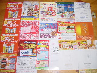 旦那も子供も爆睡してたので一人こっそり誰にもジャマされずに年間の集計をしてました 当選件数: 443件 (サンプル・先着除く)合計金額: 1086500円 (ハガキ・切手代差し引く) 前年より当選数は少ないんだけど、合計金額は目標の100万越えが出来たので納得のいく2006年でした1万前後の当選品はクオカード(1万円)、ダスキン・レンジフード掃除券、ダスキンお掃除サービス券(トイレ・洗面所)、トリノオリンピック公式記念コイン、ナイスステイ(3万円)、ソニーウォークマン NW-E405、イオニックブリーズ3.0、サンリオピューロランド入場券(4枚)×2、i pod shuffle、ナショナルイオニティ×2、天然アワビ(1kg)、ドコモ FOMA902iSシリーズ 1台、SHARP食器洗い乾燥機(なべピカさらピカ)、ディズニーオンアイス(ペアチケット)、TDLパスポート(ペア)、赤城牛すき焼き特選ロース肉(1kg)、帝国ホテルクリスマスディナーセット(4人分)&メリーズぬいぐるみ(30cm)、任天堂DSLite、モッズヘア(スタイリストツールボックス・スタイルDVD)、フラワーアレンジメント(1万円相当)