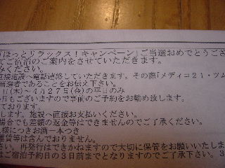 たいていいつもは25日頃までには書きあげてる月末〆のハガキ今月はの~んびりしてたせいかどうか、お友達便もここ数日たくさん届き今日までかかりました。でも、2月〆分は投函終了~~ 今日は嬉しいお届けものが1件道後温泉 ホテル八千代ペア宿泊券(一泊二食付)【メディコ21・ツムラ】 ココ~4月いっぱいまでの利用だから、3月中に行けたら行きたいなぁ~~(4月は家族旅行が入ってるからね~w)ムリかな?