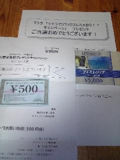 先週当選したローカルテレビ。さすがに今週はダメでした~(爆)でも先週に続き、今週もコメント読まれました( ´艸`)ムププ読まれてもな~んにもくれないんだけどね~さてさて今日のお届けものはJTB旅行券(5000円)【テトラ】富士薬品商品券(500円)【セイムス・キリンビール】テトラは2回目締め切りで、ジャグジーと入浴剤、そして3回目でこの5000円と、とても相性がいいです。前回のキャンペーンも前々回も当てていただいております。ありがとうございます~~