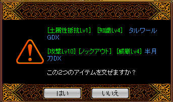ユニークアイテム。初期の頃はUが出るのは大変珍しく、高価で貴重な物であると思っていました。当時、バイパーを600万で買ったことがあります。買った理由は自分もU所持者になりたい、という気持ちからでした。当時それほど欲しかったユニークアイテム。ここ数日のドロップ今となっては良U以外はいらない^^他には速度手が出たりー。21%22%33%まあイロイロ出たって事です(*`ω´*)bさてさてドロップネタを終わりにして次にいきましょう。昨日の日記に書いてあった・・・バターゲットのための策とは!もちろん異次元です^-^;素材の値が低く、最も高く売れる物はなにか!それを考えてみました。速度スクリューなんてどうだ(・∀・)ニヤそう思い材料を探し、街をうろうろ。速度33%槍投擲器→10M異次元BOX→120Mスクリュー→70Mちょうど200M。成功を確信しているかのごとく迷わず「はい」を押すマイナード。 ・ ・ ・ ・ ・ ・ ・ ・ ・結果は察してください(´・ω・`;)