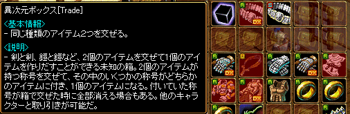 数日あけてこんばんは~ヽ( ´∀`)´∀`)ノどうもまいなです。月曜日!少し修正入りましたね~。ボス系統の死の香りによる暗殺ができなくなったのが大きい修正かな?コロ卒業し放置していたテイマ。修正があるということで日曜日はテイマのLv上げをしようと朝から晩までパブルに篭っていました。運悪く2度のバフォ↓募集を逃してしまい、馬PTに入りました。そんなこんなで上がったLvは 158→191これ13時間の成果^^;;バフォ↓入ることができたならもっと上がってたなーと嘆きました。まぁ普通に上げるよりはずっと効率良かったです('∀`)--------------------------------------------------------------------さぁさぁ!タイトルの通り、お金に余裕があったので異次元してみました!今回、作ろうとしたのは○速度スクェアこれ一心に運狩りしてきました。本当は普通に10億程度で購入予定でした。仮称:「きゃわー」さんに何度も止められていた異次元。でもどうしても成功するんじゃないの!という気持ちが出てきてしまいやってしまったわけです。だって成功すれば普通に購入するより安いでしょ^^しかも素材全部消えても3回はチャレンジできるわけだし^^スクェアは元々持っていたため、異次元・速度腰を購入。異次元220M・速度腰150M→370MなんとなくOPが1:0の方が成功しそうだったのでOP削除。機は熟した!!!あ、そういえばバディ最高値出ました^^数日でU10個↑出たけどこれしかまともなのがなかったです(´・ω・`;)異次元ボックスを利用して2つのアイテムを交ぜました。え^^;速度腰がそのまま残りましたwww素材残ったからよかったね、と言われますが・・・この結果って、してもしなくても同じってことでしょ^^;;全然よくないwwwド━(゚Д゚)━ ン !!!とお金が減りました。異次元した後、報告すると・・・ウィスキー飲みながら異次元すると成功?^^;そういうことは早く言ってくれよwwwwwその夜の露店に並べられたものは速度腰さよならヽ( ´ー`)´ー`)ノ買値で売りさばきました^^異次元の220Mが無駄になりました^^もう異次元はしません^^どうもお疲れ様でしたwwwww