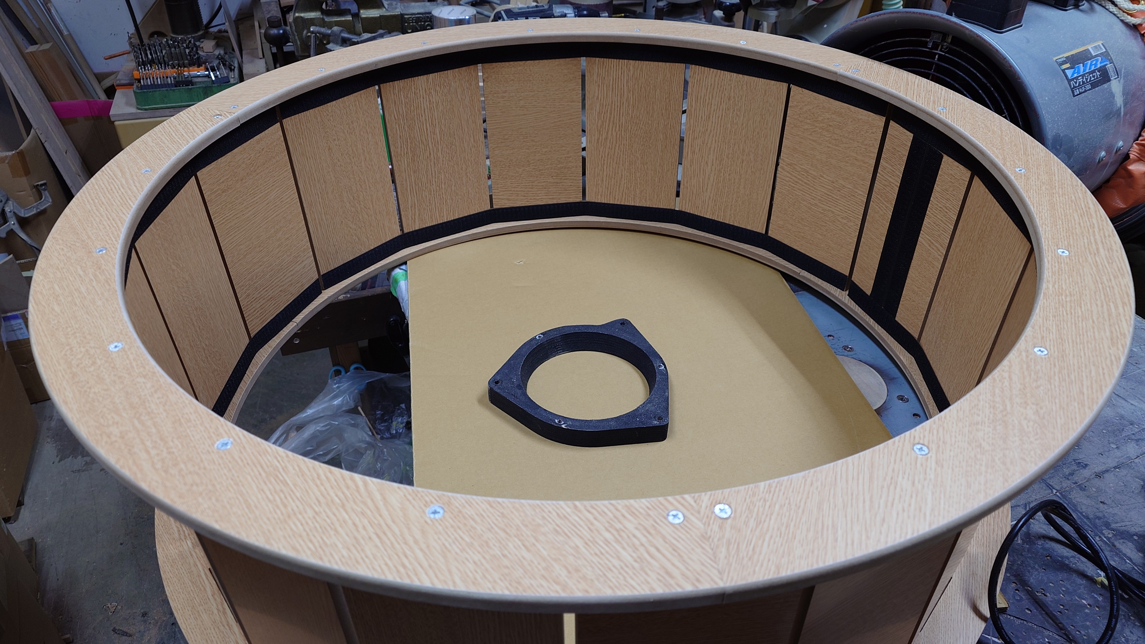 ドラえもんの道具になんかこういうのあった気がする佐藤商事の社長が持ってきたバスレフポートwww出来上がっている箱にこれが入るように穴をあけろとwwwこんだけデカいとただの穴でよくね????て思いますがポートの口径と長さで出る周波数とフェイズが変わるのでやっぱり大事ウーハーはベンチャーの12インチ弩級のサブウーハーなんだけど写真デリッてしまったらしい>。<(2024/10/05写真発掘したので追加www)12インチ 8Ωのサブウーハーとか鳴らし方に頭抱えそうwww元はディナのウーハーが履いていた箱佐藤商事社長のおもちゃ研究材料になるらしいさて杜の都仙台はぼちぼち気温が20℃を切るとか切らないとか季節の変わり目はなんか体調がおかしい本日はDA17V エブリィバンにAVIC-CL912ⅢとDS-G400のお取り付けの作業の紹介新規のお客様ですが先ず何が良いのかわからないのでご相談からとご来店いただきました悩まずに上記のセットをお勧めナビはお客様お持込みにての作業です当初、スピーカーはインナーでドアは形を変えたくないという事だったのですがどう考えても入りそうにないのでとりあえずお預かりして採寸したのが前回のブログの最後に載せた写真ww検索するとインナーで付けたところがあるようですが今回お預かりして検証した限り数字だけならギリ入りそうですがクリアランスがなさそうです仮に入ったとてコーンがストロークした時に内張に干渉しない確証が持てないのと内張が浮かずに収まる確証が取れなかったので当方は「不可」と判断させていただきました万が一入ったとて音的になにも良いことないしねと言う訳でデッドニングしてせっせとバッフル作製~一枚の耐水合板ですアウターつくりにくいデザインです最近のドアトリムってなんかデザインしにくいものが多いような自動車メーカーのステルス嫌がらせでしょうかWWWなるべくモッコリさせない方向でアウターガーニッシュ完成エブリィはスピーカーが少し高い所にあって乗り降りで蹴とばす心配が無くてよいですねこうするとDS-G300か400かわかりませんがw音はDS-G400の方が格段に良くなっています出っ張り感がわからないですね出っ張ってないんですこんな感じ↑ツイータ―のベースはミッドウーハー(ドアウーハー)のバッフルの抜いた中身を余すところなく使用しましてwwこのサイズだと別段バーチ材で作ったからとて音が良くなるとかそんなことはないかと思いますそれよりも位置や角度と調整の影響の方が大ですね^^次回はツイーターの作製ですその2に続く