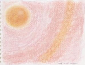 ちょっと趣味ネタに。カラーテラピーの講座は終了しちゃったけど、感情を色に表現するっていう作業は続いています。ちょっとアップしちゃいます。これは、年末に描いたもの。なんだかとっても幸せだなぁ。。。と思って描きました。コンテパステルを使って、黄色・赤・白しか使ってない絵。月が好きなんだけど、珍しく太陽のイメージです。いつも太陽も月も黄色で描いてしまうんですけど、今回違うんですよ。・・・他人事みたい^^。こんな色使いをするんだ。。。と自分でも描き終って不思議な感覚。少しずつ、一歩一歩前に進んで立ち直っているのかな・・・と思います^^。上手・下手じゃなく、感覚で見てください^^。私は、美術系は全て立体で来てるので、絵はあまり得意じゃないんです。