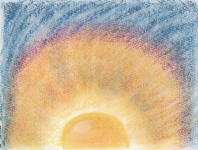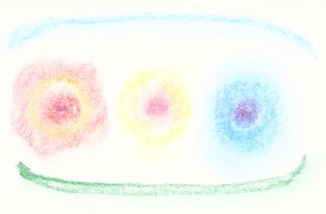 今日の絵はパステルです。今日も丸ですね。丸に意味がある事がこの絵でわかりました。初めて感覚じゃなく何かを想像して描いた絵です。友達の家族幸せそうな3人が大地と青空に包みこまれているイメージ。パステルを見た瞬間に浮かんだ情景。絵を描く時間は実際1枚につき5分前後(テーマをきいてから)しかない。だから、ほけ~っとしてる私はみんなのように書き込めない。これで解かった事。丸が人間である事。形を描いているんじゃなく、みんな人だったって事。先生に言われて気がついた。ん~。奥が深い。。。まだまだ解かった事、これからの自分の方向性についてはゆっくりと日記にして行こうと思います。