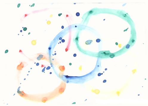 26日で楽しみだったカラーテラピー終了。なんとなく、自分が解りかけてきた。ずっとこだわっていたのは「黄色」と「丸」。他の受講生の方々は、しっかり絵を描いている。風景画・人物画。。。私は絵の才能が無いのか、テーマ「悲しい」とか言われても、色しか頭に浮かばない。んー困った。と思っていたら、先生が「私もそうなの」と言ってくださった。これは、画材でココロを判断するってテーマの時の絵。まず、水彩。駆け引き無く好き。描いてて気持よくてたぶんニコニコしてたと思う。・・・で、先生が「何を思って描いたの?」・・・?・・・水彩楽しいなって。。。・・・先生「どうして丸が重なってるの?はじいてる点々の意味は何かな?」・・・?・・・なんとなく。。。まだまだワカラナイ、謎の多いひととき。昨日その謎は解けたんだけど、まだ秘密ww。徐々に丸と黄色について日記描きます。(3回くらいかな?)いっぱい描いたけど、スキャナーが家に無いので3枚が限度ってのが正直な話(笑)。