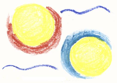 今回の絵は「オイルバー」を使ってます。やっぱり黄色と丸。。。課題は無し。今の気分で自由に描いてと言われ描きました。最初に描いたのは丸。黄色い大きな丸を左側に。。。描いた瞬間・・・太陽?で、下に赤い色下に黄色の丸。上に青い色。イメージは太陽と海に映る太陽なんだけど、月にこだわる私なので月に見える場合も。この絵は、セラピストの方には私の心理状態が解ってしまうかも。先生が「黄色と丸が気になる」と言い出した頃の絵。自分では解らずにその日も終了したけど今は意味が解ってる。するべき事があるという事。なにをすれば心地よいのかのヒントになった絵。いつも回りにある事だけど、意外な事でした。まだ秘密ww。