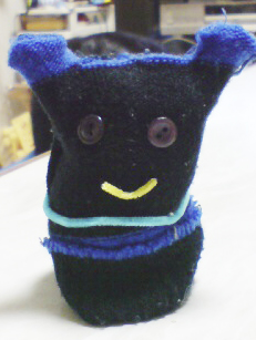 手袋がこんなになっちゃいました。裏返して指2本分ちょっと出して耳に。モールとボタンでかざりつけ、可愛い人形に変身。ちょっと手袋勿体ないけど、可愛いから許してあげよう。息子もちょっと「自画自賛」。「可愛いでしょ~☆」男の子らしさは手袋の色のみ。とても可愛らしい表情の人形になりました。こういうのって癒しだよね(*^_^*)