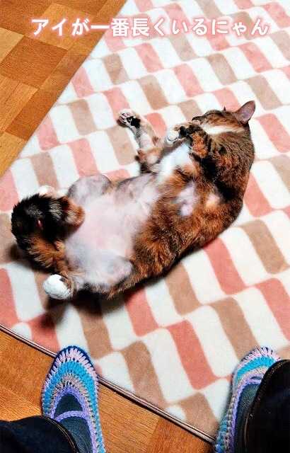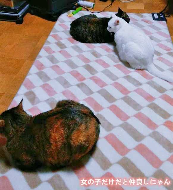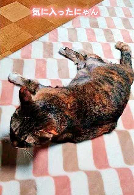 ミイは相変わらず悪い子よカーペットにユウとアイが仲良く寝転んでいたのに、ミイが来てユウに喧嘩をふっかけ、カーペットの下に潜って、みんなが座りにくくさせているのよ本当に悪い子じゃそれにしても、猫どもはみんなカーペット大好きね下から暖かいと言うのは気持ちよいわミイは、寝るときは私の布団の足元から潜って寝るのよ寒いからね。うっかり足を伸ばすと蹴飛ばしそうよアイはお腹の辺りで寝るのよじゃあね😁😸😸😸😸😸😸