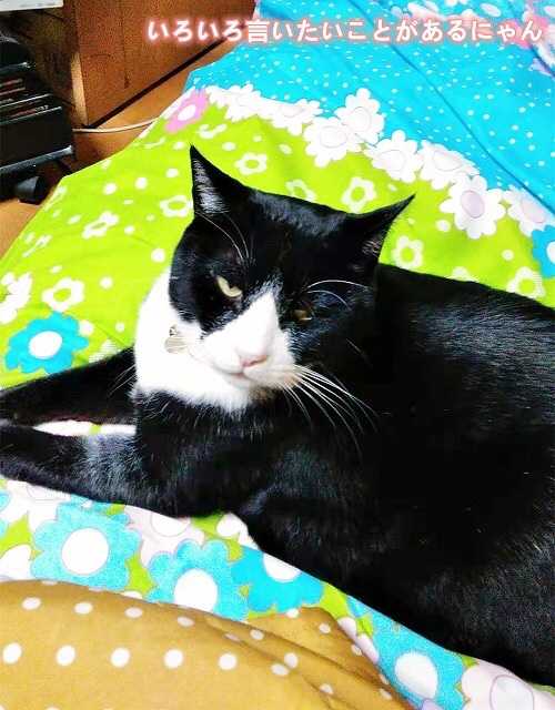 ユウですあまりかわいく写らないわね明るいと、黒目が小さいから余計目付きが悪くなるからね。でも犬猫病院に行った時、来ていた人が良い顔してると褒めてくれたよ何か言ってるみたい。「おれを変な家に連れていきやがって。あれは何なんだよ」ってかユウなりに、途方にくれてたんだよ、きっとそのときのこと、もうちょっと詳しくわかりました。夜中の3時に次男坊の部屋のドアを、ガリガリやって起こし、廊下にあったトイレまで連れて行ったんだって。片付けたら鳴きやんで、次男坊のベッドに上がり、踏み踏みしたんだって。友達がおいでをしても知らん顔。今度は長男坊の部屋に入ってベッドに上がり、ごそごそしたけどすぐ出て来て、また次男坊の部屋に行って、彼が見えるところに座ってずっと見てたんだそうよ。よほど気に入られたのよ。笑っちゃうねじゃあね😁😸😸😸😸😸😸