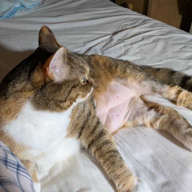 「絶対に動かんぞう。ここはわしの寝床だ😤」のアイちゃん🐈 「別に良いじゃない😤母さんのために少し動いてやった」のアイちゃん🐈でもまだ、私のベッドのど真ん中🤗自分の体が大きい自覚がないからね😆何で私が動かなくてはいけないのよ😛と思ってるのかも。今朝5時頃トイレに行ったら、クロベエが階段の上で寝ころんでいたのよ。行きはそのまま、帰りに私が足を置いた所にクロベエが尻尾を動かして、ちょうど足の下にあって踏んだわよ。ギャア!と言って、私の足を引っ掻いて、下に鳴きながら降りて行ったよ。鳴きながらじゃなくて、泣きながら😭だね😆エーンエーン踏まれたよ〜😭だよ。すぐ上がってきて、ベタベタ甘えて来たけどね😛懲りてないね😆アイも今は跨ぐときは緊張してたり、動いたりよ。 私は昨晩と今朝と今晩も同じおかずだよ。シーチキン、ネギ、ワカメ、春雨入りのオムレツ❗3回分くらいの大きなオムレツができたからね😛卵料理が好きだから何回でも良いけどね。そうめんも、3回続けても食べられるわ😛じゃあね😁😸😸😸😸😸😸