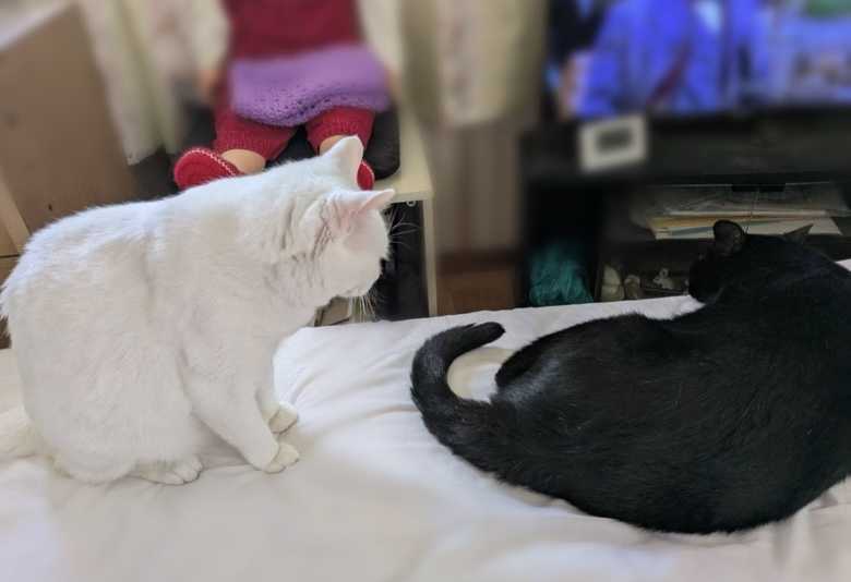 仲良しのミイとクロベエ🤗2階の押し入れの下の段よ。私のベッドも、クロベエならミイは怒らない。アイにはシャアシャア言うくせにね。でも私がベッドにいなければ、アイにもそんなに怒らない。ユウもかあちゃんを独占したくて、ミイ以外のみんなを追い出してた。ユウもミイも、強いって見せたいのかもね😉最近はアイも分かって来て、ベッドにいてミイが来ると、さっさと降りていくよ。クロベエは、ミイが優しくてうれしいね☺️クロベエが私に甘えてベタベタしてベッドに寝ころんでいる時に、ミイは頭を舐めてやったり(ちょっとだけだけどね😛)、側に自分も寝ころんだりしてるのよ。でも、クロベエは気が利かないから何もしない。ユウは長い時間、ミイを舐めてあげたのにね。クロベエは、不器用、甘え下手、生意気に気に入らないオヤツは食べない、で何も取り柄がないね😛取り柄は、かわいいところだけだね😝🥴😜🤪この頃クロベエだけ2階にいて、ほかの子はみんな下にいることが多いよ。アイがてんかんになったとき、階段を落ちたら大変だから階段に柔らかいのを敷いていたけど、もうボロボロになりました。もうアイも発作を起こさなくなったので、今みたいにふかふかじゃないのを買いました。じゃあね😁😸😸😸😸😸😸