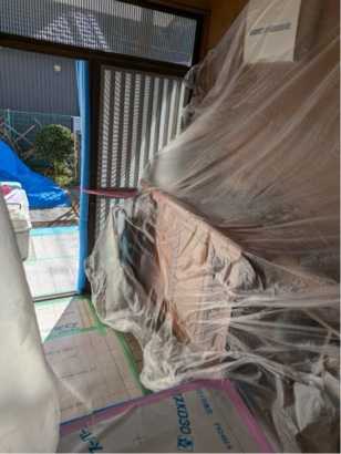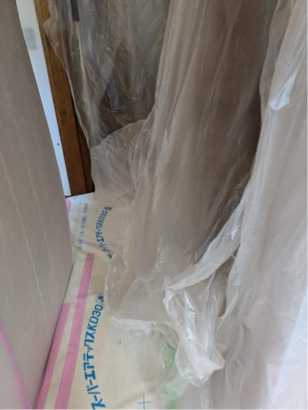 廊下から玄関にかけて全部ビニールで覆ってあってあります。
