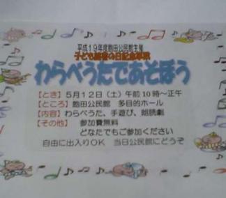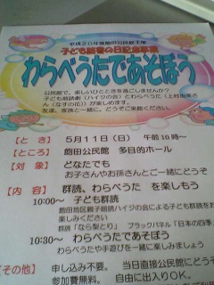 ●●●今日は個人的にかなり緊張の日です。(汗)今年2月に地元公民館、社会主事の先生からお話がきて…この3ヶ月打ち合わせを何度もしながら今日の日を迎える事となりました。 『わらべうたであそぼう』 子ども読書の日記念事業 公民館多目的ホールで行いました。予想以上の参加者数に最初から驚きでした。正直、頭の中は真っ白で…そうなると、居直ると言うのでしょうか…妙に落ち着いてきた!!!!(汗)ヤルしかない!!!状態でした。打ち合わせの段階では、小学生の参加は少ないと考えてました。が…意を反して、学童児が多い。(ひょえ~~~)あとおじいちゃん、おばあちゃんがお孫さんと参加お母さんと赤ちゃん。保育園の年少さんから年長さんの団体おはなし活動のボラ仲間。本当に大勢の方々に参加していただく事ができありがたかったです。始めは、ジョーゼットシフォンを使ってわらべ歌を5つ身体をつかったわらべ歌お手玉をつかって…身体を動かすわらべ歌 などなど約15種類のわらべ歌を届ける事が出来ました。最後は大きな円陣ができ「さよならあんころもち」でおしまい。後半は子ども朗読劇にバトンタッチ!! 過去2年間は地元のボランティア活動対象の情報交換会的な交流会がでした。しかし、もっと地域住民対象のことができないだろうかとの意見があって、どなたでも参加できる事を検討されました。私自身、公民館の図書室でも月1回おはなし会していますのでなにかお手伝いできないかな…とそのときは軽い思いでもありました。地元には親子朗読会があり、大変充実された活動を続けておられます。なので、その方たちのお手伝いできたらの気持ちだったんです。それが・・・いつの間にか、主になり場を持たせていただく事になって。本当にこの1週間は、悪い夢ばかりみてました(苦笑)全く初の試みで…おはなし会等の経験者の方たちからは「どうやってするの?」「わらべうたで1時間半は無理よ!!」と否定的な意見ばかりでした。私自身、最初のうちはイメージが固まらず苦しみました。*広い多目的ホールで行う事*出入り自由*参加対象が不明*参加者の確保上記のことはずーっと悩みのタネでした。けど、広報活動も進み、市政便りにも載りミニコミ新聞等でも取り上げていただきやめるわけには行かない状況に追いこまれ(笑)でもね、どんな状況でもやれる!と強いイメージを持つように心がけたんです。お手伝いしていただく方から強く<無理だ!!>と否定された事もきっかけにはなったんです。やってみなければ結果はわからないでしょ?!子ども達はきっとわらべうたの楽しさ、良さをわかってくれると信じたんです。結果…充実した時間になりました。イメージしつづけた以上の雰囲気作りが出来あがりました。これは、けして私の力ではないんです。たくさんの人達にたくさん助けてもらいました。本当に本当に感謝の気持ちでいっぱいです。参加者みなさんに、助けていただいたんです。本当にありがとうございました。今後の活動に向けて、反省すべき点も多々ありますがまた、ひとつ前進できたかな…今日の会が、次に向けての橋渡し的要素になったらうれしいですね。Tさん、たくさんのお手玉ありがとうございました!!みんなの喜ぶ笑顔が嬉しかったです!!***************●●●Designed by unamama