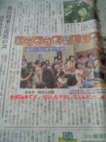 ●●●昨日(12日)の記事にたくさんのコメントありがとうございました。今朝朝刊(地方紙ですが)をポストからとり1面を見て…<わらべうた>の文字を発見!!あわてて、ページをめくると昨日の事が掲載されてました。それも、予想以上の大きさに驚き(汗)!!インタビューは受けましたし、記者さんも最初から最後までいらしたけど…こんなデカデカと(あ、私の中での基準を超えたと言う事ね)立派な見出しも付いていて、感激です。記事を読みながら、昨日の感動がよみがえりました。偶然にも、友人のコメントも載っていたからさらに驚きでした!!今回の取材はこれまでいろんな事やってきた証になります。記事になったからではなく、これからも精進しながら続けたいと思いました。ますます、気を引き締めないといけませんね!! *****************余談ですが、<母の日>に掲載された事は私を応援してくれている母に大きなプレゼントとなりました。大病と闘う母にとって、私が頑張る姿を見せる事が一番の親孝行のようです。記事になる事は教えてなかったので驚いてました。いくつになっても我が子の晴れ姿(?!)は嬉しいのでしょうね。本当に、ほんとうにすべての人達に、感謝です。●●●Designed by unamama
