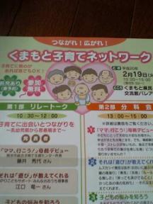 ●●● 今月、2月19日(火)10:20~15:00くまもと県民交流会館パレア10階にて『第4回子育てネットワークフォーラム2008』があります。第1部がリレートーク 5名の方がトークされます。第2部は分科会(第5分科会にわかれます)があります。昨日、実行委員会と分科会コーディネーター&事例発表者が集まり最終確認が行われました。私も参加してきましたよ!(^-^;私は第2部分科会の<第1分科会>で事例発表とコーディネーター致します。私は日頃の活動報告を実演方式で発表予定です。絵本・わらべうた等で遊び、参加者の方々とトーク楽しみたいと思います。どなたでも参加頂けます(参加無料)興味のある方、是非ご参加ください!!(託児予約は終了しましたが、第1分科会はお子様連れOK!です。)お申し込みは熊本県少子化対策課 次世代育成支援班電話:096-333-2225 FAX:096-383-1427 までお願い致します! ●●●Designed by unamama
