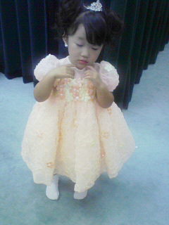 そしてこちらが洋装です 目つぶちゃった。コテコテのドレスで超笑えます冗談でこれは?って言ったらお嬢の胸にドキューン決まってしまいました もう少し考えて言えばよかったおまけに帰る時これ着て帰ると大騒ぎし、よほど気に入ったご様子って、オイオイ セレブじゃないんだから~でもまぁ~馬子にも衣裳ですな・・・ あははははははは~で、ちなみに私の衣裳は・・・っと。 ちょっとところどころキラキラした石なんぞ散りばめてあって結婚式で着用済みのものですがこれにしました決定打は、痩せてみえるし(多少?)写真だけならキラキラは写らず普通のワンピースに見えるでしょうっていうのが私の見解いかがでしょう?って主役はお嬢で私なんぞ全くいじってもらえず、立ち居地だけの指摘。髪がどうなってようと、服が変だろうと関係なし あたりまえ???ふと気づくとお腹に力を入れるのを忘れ、太鼓腹出っ放しおまけにずーどニヤニヤして歯を見せっぱなしの私であったこういう写真ってまじめに撮るものなの???