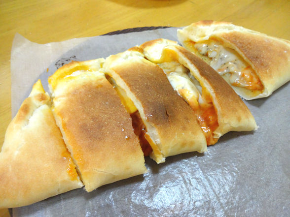 ピザはちょくちょく作っているのですが、久々にカルツォーネにしてみました♪モッツァレラチーズが無かったので、モッツァレラ入りスライスチーズで代用したの 【レシピ】1. ホームベーカリーでピザ生地を作り、丸く伸ばす2. 生地の半分にトマトケチャップとマヨネーズを合わせたソースを塗り、スライスしたゆで卵、モッツァレラ入りスライスチーズ、ピザ用チーズを乗せて、ブラックペッパーをたっぷり振り掛ける3. 具が乗っていない半分を折り返し、三日月形になる様具を包む4. 230℃で予熱したオーブンで15分焼く 切り分けた時、とろーりあふれてくるチーズがたまりません ←パン作りのブログが大集合♪ ←お料理ブログが大集合♪↑↑ 応援クリックお願いします↑↑ 本日のお勧め品です♪** 繰り返し使える!エコなクッキングシート ** テフロンクッキングシート No.B-125 (2枚入)価格:840円(税込、送料別) 【ポイント10倍】クッキングシート つるりん ノーマルL価格:819円(税込、送料別) 繰り返し使えるキッチンペーパー 【stylish kitchen シリコンクッキングシート】 キッチン用...価格:580円(税込、送料別) design by ともまお☆