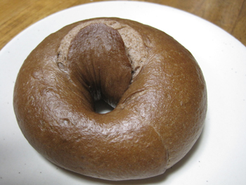 こんにちは!マツダです昨日、久しぶりにベーグルを作りました♪涼しくなってきたこともあって、あま~いベーグルが気分だったので、ココア生地にたっぷりのチョコチップを巻き込みました。温度管理もバッチリしたせいか、今までで一番、作業性のイイ生地ができ、「今回は完璧に仕上がるハズ・・・!」と、ウキウキしながら待つこと約20分。(オーブン)ピー♪ ピー♪できたぁぁぁっ!・・・おや?中央にクープが入ってる???しかもかなりキレイなクープ!!!こんなにキレイなクープ、何度もフランスパン生地でチャレンジしてるのに、1回も入ったことな~~~~い!!多分、くるくるチョコチップを巻き込んだとき、とじ目をきちんと閉じなかったんでしょうね。。。今までは、あんまり気を使っていなかったのですが、なんせ、今回は