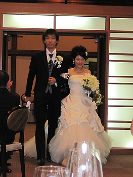 こんにちは!マツダですッおとといの日曜日は、先月でママパンを卒業された、モバイル担当ヤマダさんの、結婚式でした!!とってもカワイイ花嫁さんですよね~~!!しかも、この幸せそうな笑顔。。。女性スタッフは、全員、しばし見とれていましたなんと、ご主人とヤマダさんは、35cmの身長差があるらしいです・・・食べることが大好きなヤマダさんらしく、ワインも、お食事もとってもデリシャス~~マツダ的には、↓この前菜が一番の感動♪ひまわりのジュレですッ。他のお食事もとても凝っていて、「さすがヤマダさんのチョイスやなぁ~~」と、みんなで話していました。さらに、「ワインが美味しいので、 ぜひ、たくさん飲んで帰ってくださいね!」と、嬉しい「ほろ酔い許可証」をヤマダさんからいただいていたので、ワインもたくさん飲んじゃいましたッ。ファーストバイトなどのイベントや余興なども、笑いあり、涙ありで、さらに式を盛り上げていました。マツダも、未熟ながらピアノを演奏させていただきましたッ。何よりも、ご主人が手作りされた、2人の今までをまとめたムービーと、ヤマダさんのご両親へのお手紙が涙モノ。リアル店舗担当ウエノは、終始ぐすぐす泣いていました最後は、みんなでああ~~、どの写真も幸せそう♪♪♪ヤマダさん、お幸せにっっ