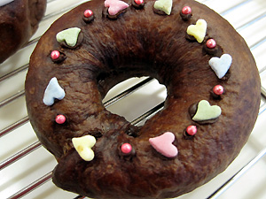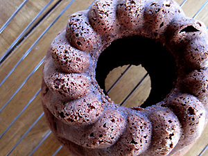 こんにちは!マツダです先日、今年のバレンタインのために、今マツダが頑張って練習している、デコ・ベーグルのお話をさせていただいたのですが、実は、毎年何種類かチョコものを作るマツダ、もう一つ練習しているケーキがありまして・・・じゃんっ。めちゃめちゃ上手にできて、我ながらビックリ!!!!!だったので、ここに載せさせていただきますッ。不器用なマツダにしては、めずらしくまさに、快心の出来!!!アーモンドプードルを使うことで、しっとり感が前面に出た、チョコレートクグロフです。マツダとこのケーキの出会いは、去年の春。フォトカードやコラムでお世話になっている、イラストレータのake.さんお手製のこのケーキをいただいたんです。その時は、確か、バンホーテンのクーベルチュールでお作りいただいた。とお伺いしたように記憶しています!バンホーテンのクーベルチュールは、香り高くも、後味あっさりなのですが、そのバンホーテンが、すっごく濃厚に感じられ、さらにしっとりホロホロの絶妙食感だったので、ど~~~~しても作りたい!!!!と思い、レシピを教えていただいたんです。すると、そのレシピを見てびっくり!薄力粉一切不使用。粉はアーモンドプードルのみ使用。あとは、た~~~~っぷりのクーベルチュールと、卵などのケーキに使う基本材料。とあるレシピ本にあるレシピだったので、著作権の関係上、このレシピを公開することはできないのですが、きっと、普段のケーキに使う薄力粉の一部を、アーモンドプードルに変えていただくだけで、かなり食感の違う、しっとりめの仕上がりになると思います。アーモンドに含まれる、たっぷりの油分がその食感を生むんでしょうね~~。目からウロコでしたぁ。。。もうご存知の方もいらっしゃるとは思いますが、このしっとり食感、ぜひぜひ、味わってみてくださいね!!!!