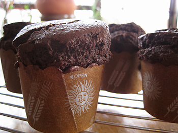 こんにちは!マツダです先週、フランスの地方菓子を作りたいな~というお話をここでさせていただいたのですが、先週末、マツダ家に遊びに来たヤマダさんが、「チョコマフィンが食べたいです」と仰ったため、チョコマフィンになってしまいました。僅かに残っていた、国産全粒粉(薄力粉タイプ)を加え、ココアパウダーと砂糖、油脂がたっぷりのマフィンに、一筋のヘルシーな光を取り入れてみました。バターなどを少し控えめにしたせいで、ケーキよりは、ファストブレッドに近いような食感…。う~ん、やっぱり、バターをけちらなければ良かった!!!ヤマダさんは、「チョコと全粒粉って合うんですね!!!」と、たいそう喜んでくれたので良かったのですが、マツダ的には、もうちょっとしっとりした方が好み。バターを減らすなら、タマゴの量をその分だけ増やせばよかった・・・・と少し後悔してしまいました。次は、タマゴの量を少し増やして、カカオパウダーも、溶かしたクーベルチュールにして、しっとり感を強調したマフィンに仕上げたいと思いますッ。ちなみに、そんな細かい計算が全くいらない、【しっとりケーキマフィンミックス】は、手軽に、どっしり・しっとり系のマフィンが作れるのでオススメ。ページで紹介中の各アレンジレシピを参考にしていただいて、プレミアムなマフィンを楽しんでくださいね