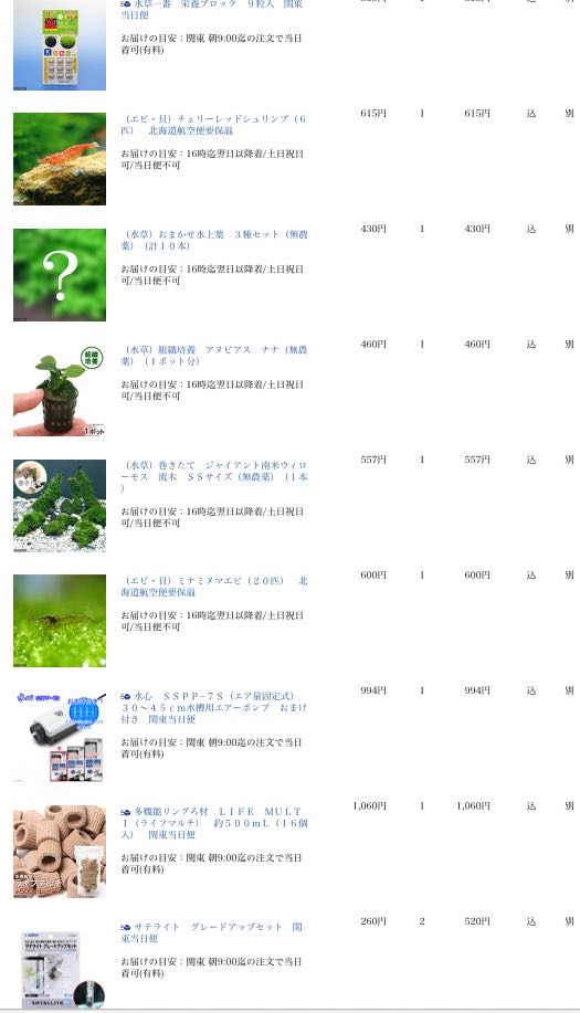 またまたcharmさんで ポチッと…(*´∀`) 9点の¥5539-。 水草は購入したことが あったけど、 生体(エビちゃん)ははじめて。 無事到着するまで、 ちょっとドキドキ。 (エビ・貝)ミナミヌマエビ(20匹) 北海道航空便要保温 (エビ・貝)お一人様3点限り チェリーレッドシュリンプ(18匹) 北海道航空便要保温