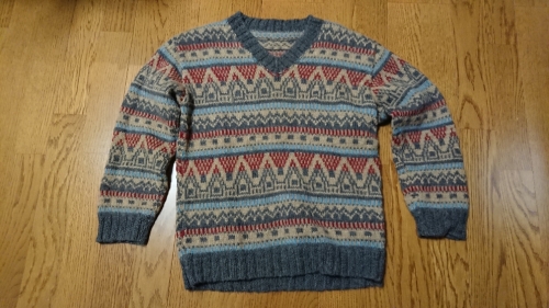 昨日から旅レポの続きを書こうと思っているのですが、新しいスマホのアルバム機能が思っていたのと微妙に違うし、楽天写真館の方も依然と変わったところがあるような感じでもたもたしてしまうしで、写真館への写真のアップが、数枚ならなんとかでも、旅先での大量の写真となると困難を極めています。頭が大分熱くなってしまったようなので、今は写真館からちょっと目をそらして、明日か明後日改めて旅レポアップにトライしたいと思います。で、今日は全く趣を変えたものをご覧に入れたいと思います。それは、これ、わたしが編んだ最初で最後の編み込みセーターです。編み込みの柄をもう少し大きくするとなかなか素敵な色柄でしょ?実は35年くらい前に編んだものです。たまたま本屋さんで出会った編み物の本の表紙になっていたこの作品にほれ込み、編み込みどころか、無地のセーターを編んだ経験もなかったのに、本を買ってしまいました。毎日本を眺めては諦め、また取り出して眺めては諦めを繰り返した挙句、いくらぐらいかかるのか調べに手芸やさんにリサーチに出かけました。ところが、本に載っていた毛糸は近所の手芸やさんでは扱っていなかったのでです。糸の種類は、わたしも初めて目にする「アルパカ」というものでした。今ならそれほど珍しくはないのでしょうが、35年前には、手芸やさんのおばさんでさえ知らない種類でした。駅の近くの少し大きな手芸店には、別の種類のアルパカ糸は売っていましたが、この糸は中細程度なのに、並太というそれより太めの糸ばかりです。それでは超初心者のわたしには使えません。編み物をする人は、編み始める前に、ゲージというものを取ります。本には、編もうとする作品の製図が載っていて、前身ごろなら何目作って何段編むか、どこをどの色で、どんな編み方で編むかが指定されていますが、それは標準のサイズと標準のゲージで作られ計算されたもので、着る人によってサイズがちがうし、そうなると編み方も変えないとなりません。本と同じサイズに仕上げる場合でも、同じ糸で同じ編針を使って編んでも、人には編み癖があって緩く編む人ときつく編む人とでは、編み目の数や段数やが同じでも、仕上がりサイズが違ってしまいます。そこで、作品を編む前に、使おうとする糸と針で試し編をし、10㎝四方が何目×何段がになっているか数えます。それがその人のゲージになるのです。本式に編むのなら、編もうとする作品の製図を参考に、作りたいサイズと自分のゲージに合わせて作図をし直します。一応、中高生の頃の家庭科でその程度の知識は得ていましたが、実際にはどうしたらいいのやらちんぷんかんぷん。それに、超初心者のわたしには製図をし直すなんて全然無理だし、だいいち、ゲージなんて取っても編んでいるうちに目が変わってきちゃうから無意味だし、だから最低限本と同じ糸じゃないとダメなわけです。それに、何より色がないのです。何店か回っても、アルパカといえば、白、黒、こげ茶、ベージュぐらいで、赤だの水色だのは、まず見つかりませんでした。なんだかだんだんムキになって、気づけばとうとうデパートまで行って、同じメーカーの同じ糸の同じ色の取り寄せを注文していました。取り寄せなのでばら売りはしてもらえず各色10玉単位で注文したような気がします。だからお値段も、材料費だけで、今でも高級なセーターが買えるくらいの金額になってしまいました。自分で自分をがけっぷちに追い込んだような格好で、生まれて初めての編み込みセーターに取り組み始めたのでした。秋ごろから編み始めて、出来上がったのは12月の末くらいだったでしょうか。たぶん3か月くらいかかったと思います。出来上がりをよく見ると、模様の間違いとかもある(2枚目のアップ写真をよく見るとわかりますよ)のですけど、そんなことはなんのその、本当に天にも昇る心地でした。お値段も手間も半端じゃないのでなかなか着られず、しかも、アルパカ自体が温かい素材なのに、2本取りのメリヤス編みで、編み目が詰まっていますし、さらに裏も糸が渡っているので、実際には4本取りの糸で編んでいるのに近いため、過度に暖かくて、それでもその冬は、スキーに来ていったり、たぶん3回くらい着たと思いますが、翌年以降はほとんど着て出かけることはありませんでした。そうこうしているうちに、衣替えの時にベンチ入りすることもなくなりいつしか持っていることすら忘れていました。でも、今年は、もうすでに3回くらい着て出かけました。というのも、わたしが去年の春、京都にご一緒させていただいたブロ友のnaomin0203さんは、布や糸を使った手仕事の大好きな方で、いつもステキなお洋服や小物を作っていらっしゃいます。で、冬は当然編み物。たまたま昨日のブログもそれで、手作り物の大好きなわたしは、こういう手仕事のブログの時はいつもほとんどため息で窒息しそうになりながら読んで