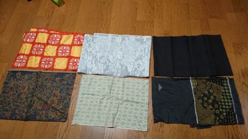 昨日今日と夫社長が出張なので、晩御飯の支度が要りません。おかげで、今年はやらないつもりでいたふるさと納税、昨夜、金額の目安を計算して、サイトを見て、大体決めたので、やっぱり今年もすることになりそうです。で、今日は、底冷えのする3階の押入の前に、モコモコに着ぶくれて陣取り、この前の日記に書いた南木曽ねこ、ねこ半纏を作ってくださる方に依頼しようと材料選びをしました。これから解いて洗ってアイロンかけるのは大変なので、既に解いてあるものの中から選ぶことにします。とは言え、洗ってアイロンかけの済んでいるものから、解いただけでまだ糸くずもいっぱい残っているものまで状態は様々。やはりアイロンかけまで済んでいるのにしようと選り分けてみたら、何かを作った残りとか、洗濯で色落ちや色移りして使えなくなった部分を除いた残りとか、そんな半端ものというか端切れみたいなのがいくつかあったので、そこから選ぶと無駄がないなと。。。おお、なんてしっかり者のわたし!(ケチともいう?)ということで、選択肢が大幅に狭まったおかげで、思いのほか簡単に決まってしまいました。選んだのはこの6枚。どうせなら裏地も送ったほうがいいかなと思って、6枚ということは3組です。わたしのはこのペアが第一候補。左が村山大島紬(大島紬を参考に東京都武蔵村山市で生産された紬)で、実際の地の色はもう少し緑がかった青です。右は綸子(?)の生地に絞りの格子柄。右の絞りは、洋服にリメイクするにはちょっぴり勇気のいる色柄ですが、実かなり気に入っていて、ねこさんの裏地にはぴったりかな?と思ったりしています。これは、第2候補のペアです。右は平紬、左は何という生地かわかりませんが、母の着物でした。平紬は白っぽいので汚れやすいですが、前身頃がないとあまり汚れないだろうから、大丈夫かなって思っています。ただ、このペアは、ちょっとインパクト不足じゃないかな?ということで候補としては2番手です。ついでに見つけたこちら、パンツを作るつもりだった濃茶(こげ茶?)色の紬です。夫のねこさんを作る分くらいは余りそうなので、いいのじゃないかと思って。裏もちょうどいいのがあるのですよ。しっかりした羽織裏です。チュニックでも作ったら素敵だと思っていた、チャコールグレーの地の生地ですが、日焼けが酷くて、色褪せや変色したところを外すとチュニックを作れるほど残らなそうなので、ねこの裏に使ってもらおうかと思います。どれもしまい込んでいたので激しくたたみじわができてしまっているので、やはりもう一回アイロンがけしてからじゃないとダメですね。あ、その前に店長さんにメールして布の必要量とか聞かないと。