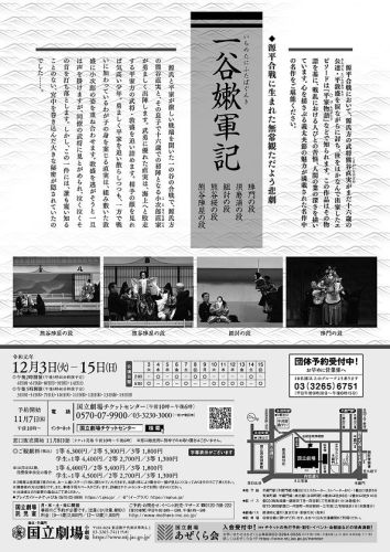12月14日土曜日、先週に引き続き東京国立劇場にいきました。12月文楽公演「一谷嫩軍記」(いちのたにふたばぐんき)観劇のためです。14時開演なので、半蔵門線に乗る前に軽くお昼をしておこうとパン屋さん「浅野屋(錦糸町テルミナ店)」のイートインスペースへ。このお店の食パンとかフランスパンが好きでたまに買うのですけど、この日はサンドイッチとアップルジャムのたっぷり入った紅茶を戴きました。サンドイッチもパンが美味しいので格別です。でも先を急ぎますので、ゆっくり味わってもいられず、ササッと食べて地下鉄に乗りました。半蔵門に着き、電車を降りようとドアの前に立つと、ホームドアの向こうに見覚えのあるお顔が見えました。なんと、前の日記に書いた人形遣いの吉田玉男師匠、午後の舞台には出演されないので、今日はもうお帰りのようです。玉男さん、とってもオトコマエでいらっしゃるのですけど、お顔をまじまじ眺めたりなんか致しません!さりげなくすれ違いました。そう言えば、吉田玉女さんだった玉男さんが、師匠の初代吉田玉男さんのお名前を継がれた二代目吉田玉男襲名披露の公演の演目がこの一谷嫩軍記でした。その頃わたしはブロ友のnaominさんに誘って戴いて文楽を見始めたばかり、まだ2回目か3回目だったでしょうか、何もかも目新しくて、文楽の理不尽な筋運びすらすごく新鮮で、というか、毎回「え~~なんでそうなるの」と思うばかりで、居眠りするどころか、最初から最後まで目を爛々と光らせていたことを思い出します。考えてみると、翌年の国立劇場開場50周年記念公演の出し物も一谷嫩軍記でした。この時は40年振りという初段、2段目、3段目の通し狂言でした。(一谷嫩軍記は、実は五段目まであるのですが、三段目までが並木宗輔の作品、しかも絶筆ということもあって、その後の段(別の戯作者が書き足したものだそうです)とは別扱いなんだそうです。一谷嫩軍記は、平家物語の「敦盛最後」にも描かれた、一ノ谷の合戦で熊谷次郎直実が無官太夫敦盛を討った物語です。源氏の侍大将熊谷次郎直実が、弱冠16歳の平敦盛を討ち取ったことで世の無常を悟り出家したという話は世に広く知られ、能や舞にも(のちには小学唱歌にも)なっていました。この物語を、戯作者並木宗輔が、直実が首を刎ねたのは平家の公達敦盛ではなく、敦盛と同じ16歳の我が子、小次郎直家という、全く違うお話に作り変えてしまった、それが一谷嫩軍記でした。三段目での衝撃のどんでん返しに、この時代の観客たちはどれほど驚いたことでしょうか。平家物語を読んだことがある、内容をよく知っているという人より、その反対の人の方が断然多い現代と違い、「直実は敦盛を殺した犯人だ」というのはその時代の一般常識だったに違いありませんし、なにより、人々はお芝居のしょっぱな、組打ちの段で、直実が敦盛の首をはねる場面を目撃しているのです。しかも、横恋慕する平山何某に刺され近くの物陰に倒れていた、敦盛の妻である玉織姫が直実の声を聞いて瀕死の状態であらわれ、「もう目も見えない!」と言いながら刎ねられた敦盛の首を掻き抱いて息絶えて、観客は若い二人の悲恋に涙を絞り。。。結果、彼らの中で敦盛の死は確定事項となります。でも、実はその時彼女は「目が見えない」のです。これが伏線で、三段目に見事回収されるわけです。更には、桜の若木の前に義経が立てさせた「この桜の枝を切ってはならない」という制札の文言「一枝を切らば一指を切るべし。」、これに込められた義経の命令・・・若木を敦盛に見立て、彼を斬るのなら一子を切れ・・・も熊谷によって三段目で解き明かされます。とはいえ、それだけだったら当時の人たちでさえ、「なんてむごい命令!」とか「主に命令されたからというだけでわが子を殺す親がいるだろうか?」などと反感や疑問を持ったに違いありませんが、そういう観客も納得させてしまうような伏線が、やはりお芝居の初めに仕込まれています。それは敦盛の父経盛が実は敦盛は後白河法皇の落胤であると明かす場面です。つまり、平家が滅亡し、幼い安徳天皇が亡くなれば、敦盛が天皇になるかもしれないということなのです。それを知った義経は敦盛を討ってはならないという命令を熊谷にこの制札で伝えたということ、もちろん熊谷もそれを知ったから、泣く泣くわが子を討ったわけなのです。現代のわたしたちにはわが子を殺す理由にはなりませんが、当時の人たちは納得したのでしょう。熊谷直実が出家するのも、敦盛を切ったからではなく、実は主の命令とは言えわが子の命をわが手で絶ったことが理由なのだと、改めて深く頷いたことでしょう。こんな風に、あちこちにたくさんの伏線が張られ、のちにそれがしっかりと回収されていて、まるで良くできたミステリーのような作品です。細部までシッカリ作りこまれていて、ここまでされたらもう何も言うことはない、気持ち良く騙されておこうと