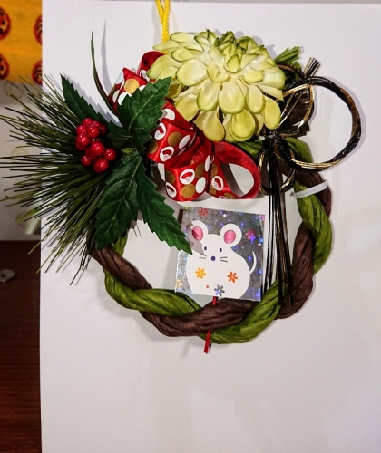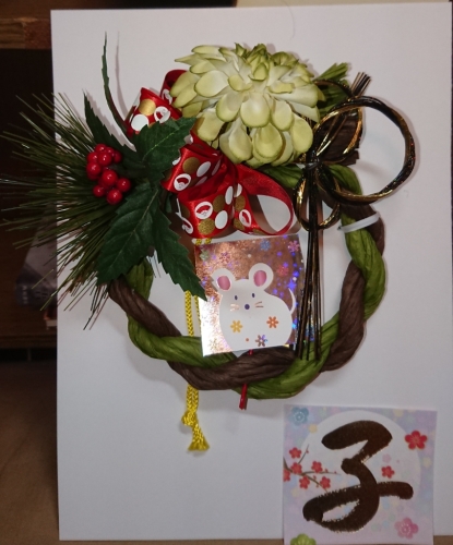とと昨日書いたお正月用のリース飾りの件、色々アイディアをありがとうございました。パソコンでダウンロードしてプリントアウトという提案は、その手があったか!と飛びつきかけましたが、肝心のプリンターが、我が家のはレーザープリンターで、フィルムラベルや写真用光沢紙があまり売っていないし高いのです。ということで、今日、まず100均に行ってみました。でも、家のそばの100均はすごく狭いお店なので、お正月用品がまだほとんど並んでいませんでした。スーパーも小さくて狭いのであまり期待できそうにないとは思いましたが、ついでなのでそちらにも回ってみました。そしたら、年賀はがきの注文コーナーがあって、そこにけっこうたくさんの年賀はがきの見本がおいてあったのです。聞いたら、持って帰って構わないというので、4枚ほど戴いてきました。図案の部分を切り取ってカードの上に載せてみました。あまり上手に写っていませんが、リースの中にはめ込んだのはネズミさんのイラスト、下に置いてあるのか「子」という字一文字のもの。文字は大きすぎるので、はめ込むのはムリみたいですね。こちらはネズミさんのシルエットが銀箔で描かれたもの。小さな枠に区切られているのでもう一回り小さくしても良いですね。最後は光るブルーのネズミさん。どれもハガキの用紙に印刷されているのでしっかりしているのがいいです。もう少し遅くなったらもう一度100均を見に行ってみるつもりですが、↑の中から決めてしまっていいかなと思っています。
