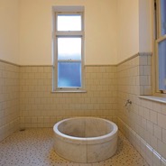 こちらが浴室。トイレは水洗トイレで、浴室は日本式の浴槽のついたお風呂でした。どちらも壊れて、壁や床に貼られたタイルの傷みも激しかったので修理をする計画だったそうですが、タイルの貼り方一つにも難しい技法が使われていて、現代の技術では再現不能とわかり、応急処置だけ施し、現在は立ち入り禁止にしているそうです。