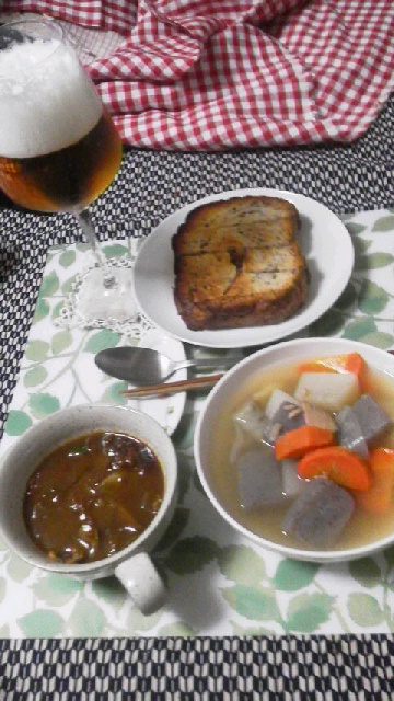 独居だからな!黒豆パンにカレーつけて、ビールまであるんだよ、