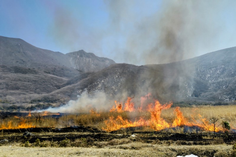 くじゅう連山に春到来坊がつる湿原の野焼きを見に行ってきました活動記録はこちらに掲載しています坊がつる北端のマンサク